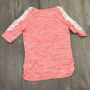 Maurices Blouse 3/4 Crochet Sleeve Design Round Neck Knit Ruched Heather Pink S