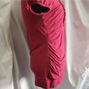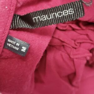 Maroon blouse with a ruffled front, short sleeves, and cinched sides.