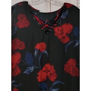 Maurices Blouse Womens Extra Large Black Red Floral Chiffon Crisscross Semi Sheer Top