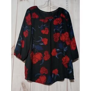 Maurices Blouse Womens XL Black Red Floral Chiffon Crisscross Semi Sheer Top