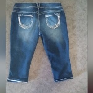 Stylish blue capris with distressed details. Comfortable fit. Perfect for casual wear. 36 in waist, 19 inch inseam. 019