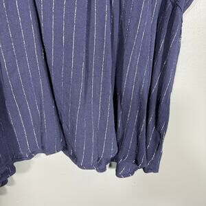 Women's plus size boho fairy babydoll top by Maurices. This blue sleeveless top has a metallic silver stripe, crochet lace, and ruffles at the sleeves. It is a rayon blend.