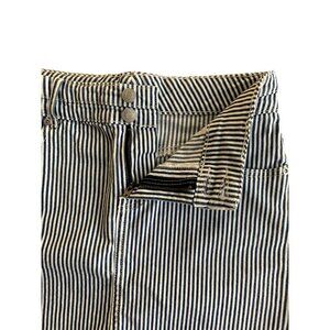 This striped denim skirt offers a classic and versatile style, featuring a blue and white pattern. Crafted from a cotton-spandex blend, it ensures a comfortable fit and flexibility. The skirt's design includes a zip and button closure for a secure fit, making it suitable for various occasions.
