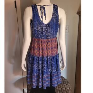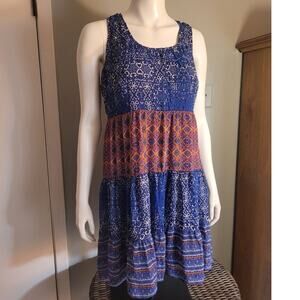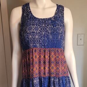 Bright and carefree sundress from Maurices, perfect for summer days, vacations, or beach outings. Crafted in a colorful Aztec boho print with tones of blue, orange, and magenta pink. Designed with a flattering fit & flare silhouette, this dress offers both comfort and style.