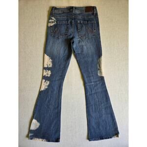 Notes: Mid-rise bootcut jeans in medium wash denim with intentional bleach wash details, stretch fit, five-pocket styling, and embroidered back pockets. Trendy retro-inspired look with soft feel and slight stretch. See photos for details.
