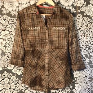 NWT! This Maurices top is cute and made of lightweight material. Front buttons lead up to a collared neck line. Two front chest pockets. The waist is slightly cinched for a more fitted look. The long sleeves have two buttons for closure or can be rolled for a cute look. Longer in length. Made of 100% cotton. Smoke free home.