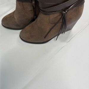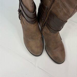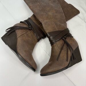 These stylish over the knee boots from Maurices feature a rich brown suede finish, offering a soft and matte texture. Designed with a comfortable wedge heel and a slouchy style, they are perfect for adding a touch of elegance to any outfit. The boots also include a subtle ankle strap detail and a convenient inner zipper for easy wear.