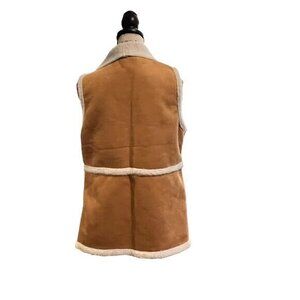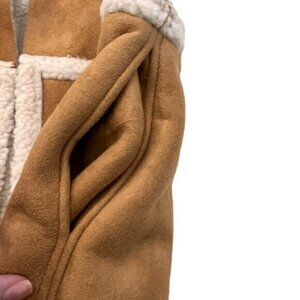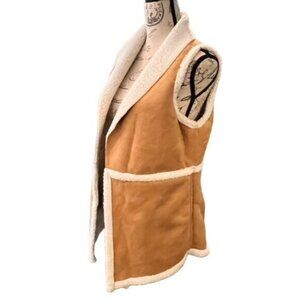 Light tan faux suede with sherpa lining. Sleeveless with open front. Pockets. Mid-length