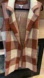 Stylish sleeveless cardigan. Features a brown and cream plaid pattern. Perfect for layering.