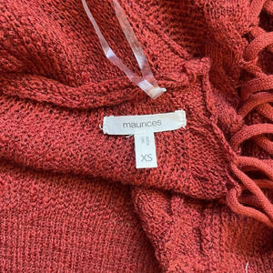 Maurices burnt orange knit open cardigan. In excellent condition! Open front. Long sleeves. Asymmetrical front. Strappy detail on the neck. Lace up back detail. Lightweight knit material. Burnt orange color. Size xsmall.