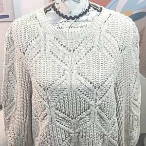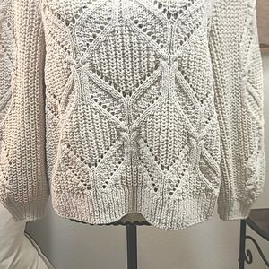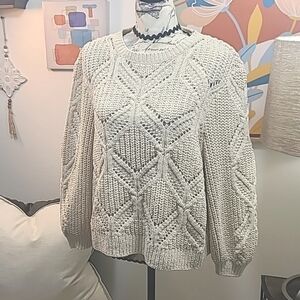 Adorable cable poly knit. Soft and cozy feel. Oversized arm with shorter hem.