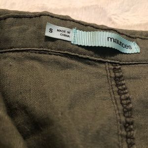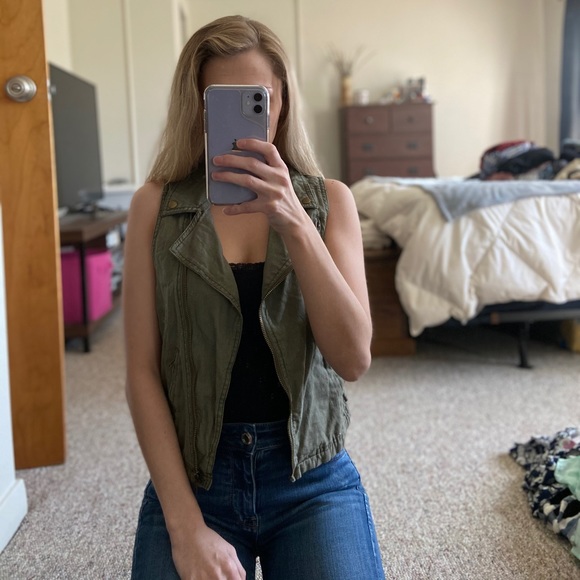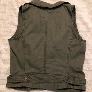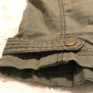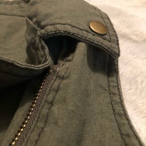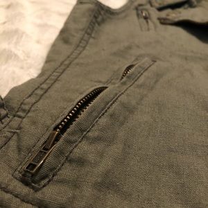 Maurice’s. Size small. Army/olive green. Copper colored details. Pockets on front. Button design on back.
