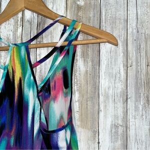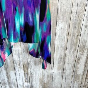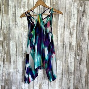 Vibrant sleeveless top with an asymmetrical hem. Features a multicolor abstract pattern.