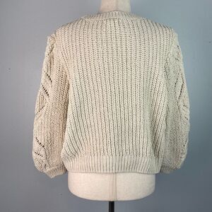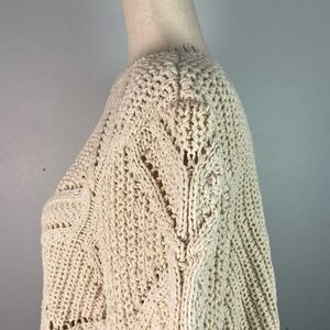Stay warm and stylish with this cozy beige knit sweater. Perfect for layering, this sweater offers both comfort and elegance. Ideal for any casual outing. it measures 21 inches armpit to armpit laying flat and features a slightly cropped fit at 18 inches in length from the shoulder to the hem.
