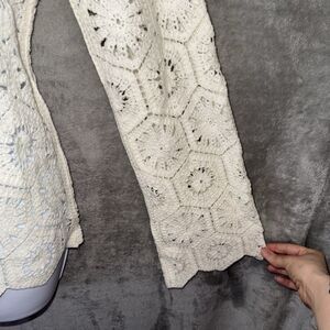 Beautiful crochet knit sweater featuring a hexagon floral pattern throughout. Lightweight, semi-sheer design with scalloped hem and long bell-style sleeves. Perfect for layering over tanks or bralettes.