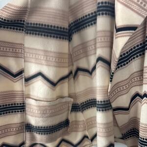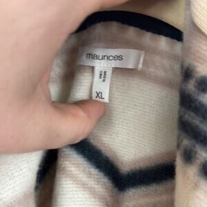 This Maurices cardigan in cream and black combines style and comfort with its open-front design and draped collar. The full-length sleeves and longer length make it an ideal choice for layering during cooler weather. Its cozy fabric ensures warmth while maintaining a chic appearance.