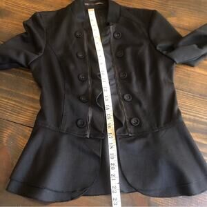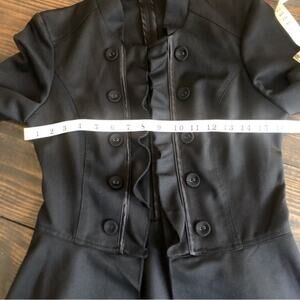 Maurice’s Cropped Black Open Blazer Women’s S Ruffle Ruched Sleeve Cuff Peplum Hem Spandex Quiet Luxury Career