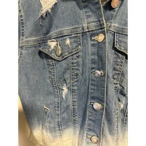 Sandblasted medium wash with open ripped detailing. Button front with flat top pocket and side slanted pockets. Long sleeves and frayed hem. Excellent condition. Great over a dress or GLAM it up!