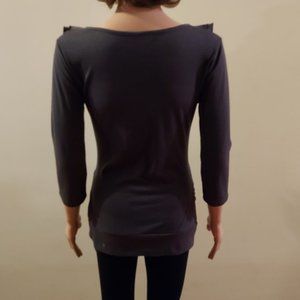 Description: Beautiful elegant dark gray 3/4 length sleeve v-neckline ruched down front of top with band around bottom.