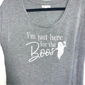 Maurices dark gray & white ghost graphic tee. In excellent condition! Scoop neckline. Short sleeves. Rounded bottom hem. Jersey knit material. Just Here For The Boos graphic in white. Dark gray color. Size medium.