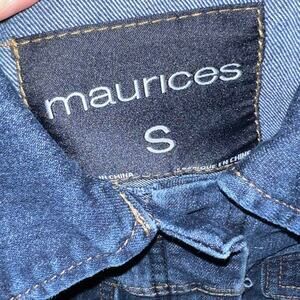 Classic Maurices denim jacket in a versatile dark wash. Size Small with traditional jean jacket styling including chest flap pockets, copper-tone button front closure, and tailored seaming. Measurements: 20" length, 16" bust (32" around), 15" waist (30" around), 24" sleeve length. Made from sturdy denim with a medium weight and slight stretch for comfort. Features a flattering cropped length that hits at the waist. The dark indigo wash makes this piece easy to dress up or down. In excellent pre-owned condition with no visible flaws, stains, or wear. All buttons and stitching intact.