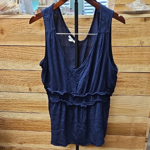 Elegant deep blue tank with ruffle detail. Perfect for layering or wearing alone.