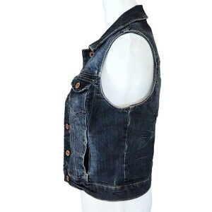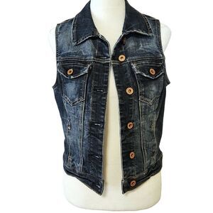 Maurices dark blue, cropped, distressed denim vest with chest flap pockets and two slip pockets.