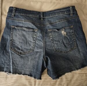 Trendy distressed jean shorts by Maurices. Features button fly and frayed hem.