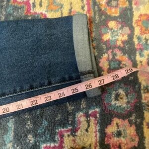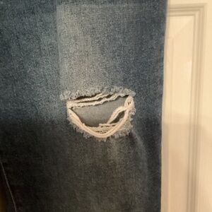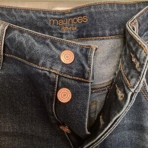 Maurices distressed, button fly. Size 14 regular with cuffed bottom, that can be uncuffed. The distressing shows skin.