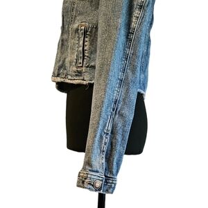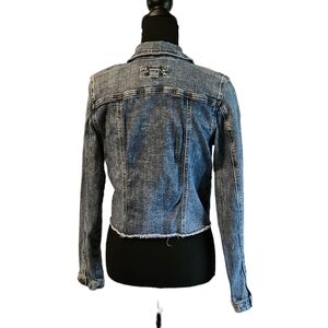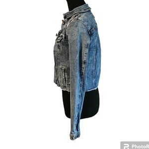 Button Up raw edge hem denim jean jacket with 2 upper button close pockets and 2 lower hand pockets. Cropped with single button cuffs. Size XS