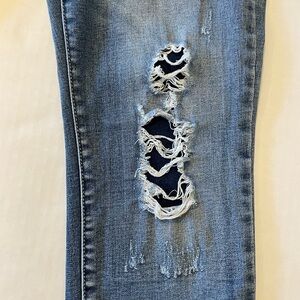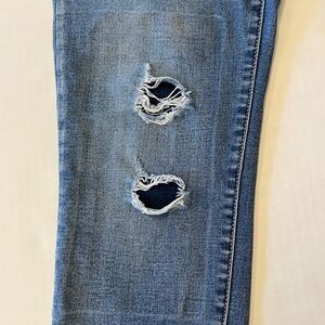 Maurice’s distressed jeans have five pockets with front zipper and button closure. Gently worn and in good used condition.