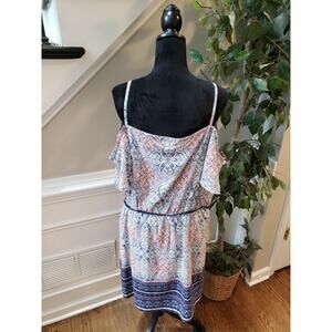 This boho-chic Maurices cold shoulder dress in size XL features a gorgeous blue and pink tribal-inspired print. Designed with adjustable spaghetti straps, a flattering faux-wrap front, and a waist tie, this soft midi dress is perfect for summer, beach vacations, or casual days out.