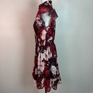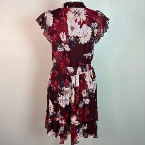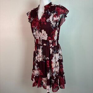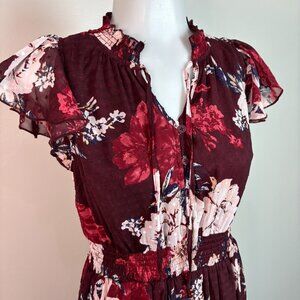 Maurices Dress XS Burgundy Floral Elastic Waist Flutter Sleeves Tie-Neck Women's