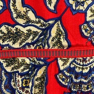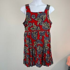 Red floral print skater dress. Lined. Sleeveless with criss cross straps in the back. Fun detail at the waist gives a hint of skin underneath. Ties at waist. Lightweight crinkle style fabric.