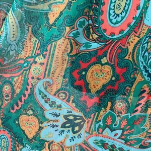 Flowy fabric with a paisly print. Halter neckline with keyhole. Elastic at the waist.