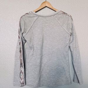 Women’s size XS Maurice’s light tan and muted dusty rose pink or mauve long sleeve sweater top with sequin embellishments. Boho distressed design with raw seams as shown. Good preowned condition with normal wear and no flaws, clean nonsmoking home. Approx 17” across chest pit to pit laid flat, 16” pit to lower hem side length, 18” pit to wrist sleeve length.