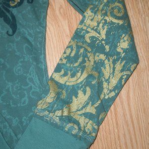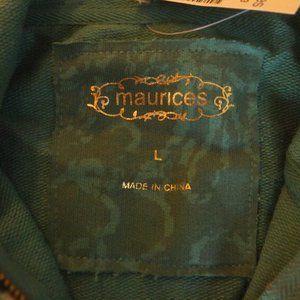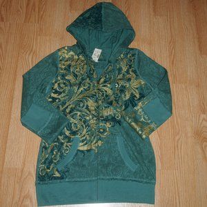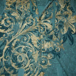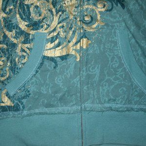 Super cute Maurices embellished "graphic" hoodie. Full zip-hoodie features a gold foil graphic across the front, hood, and arms as well as embellishments on the front. Hoodie is a slim fit and is lighter weight - perfect for those cool summer nights! Hoodie is a size large and is brand new with tags!