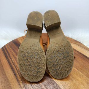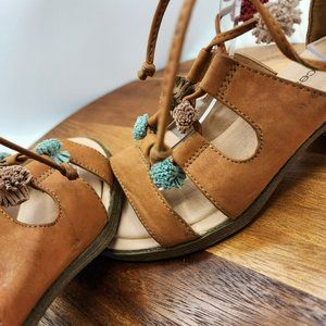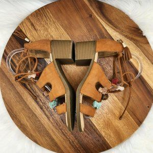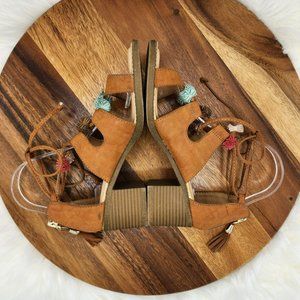 Maurices Ember Sandals 7 Camel Brown Zip Back Strappy Lace Up Tassel Stack Heel