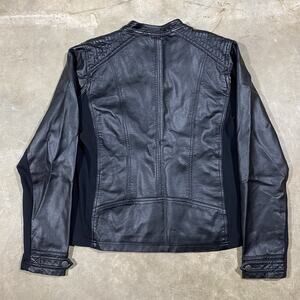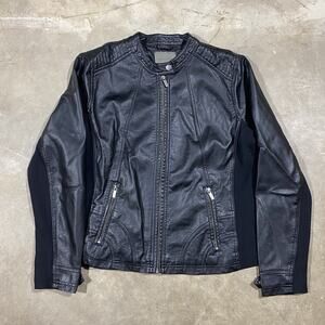 Women’s Maurices black faux leather moto jacket, size Large. Features quilted shoulder detail, zip front closure, and zippered side pockets. Stretch fabric panels along sides and sleeves for a comfortable fit.