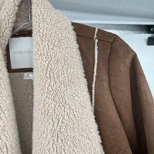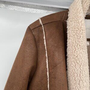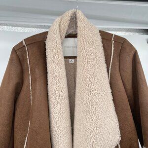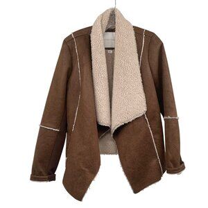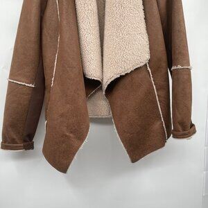 Maurices Faux Suede Open Front Coat Sherpa Lined Brown/Cream Size Large Pockets