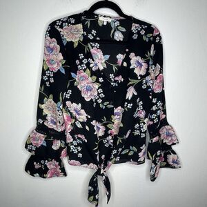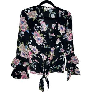 Maurices Floral Blouse Size S Button Front Tie Hem Tiered Bell Sleeve Boho