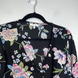 The Maurices Floral Blouse in size S features a beautiful floral pattern with a tie hem and tiered bell sleeves for a boho chic look. The blouse has a V-neckline and button front closure, making it perfect for casual occasions. Made of polyester, this blouse is machine washable and designed for regular fit and size type. In a stylish black color with pink flowers , this blouse from Maurices is a versatile and fashionable addition to any woman's wardrobe.
