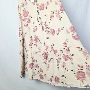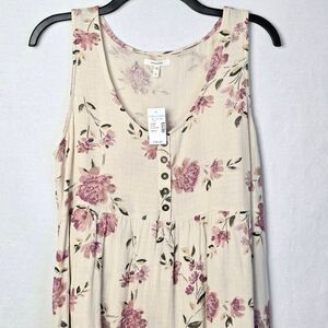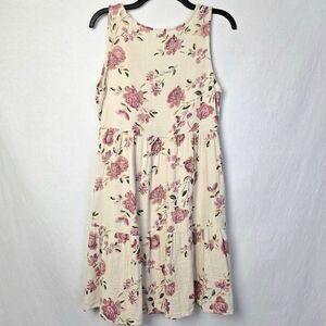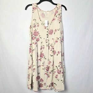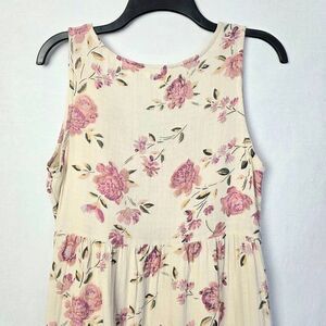 Maurices women’s sleeveless dress, size Small. Cream base with pink floral print, V-neckline with button front detail, and tiered skirt. Lightweight 100% cotton fabric. Perfect for spring and summer wear. New with $34.90 tag attached.