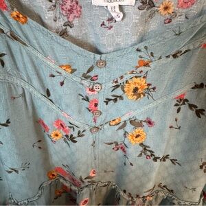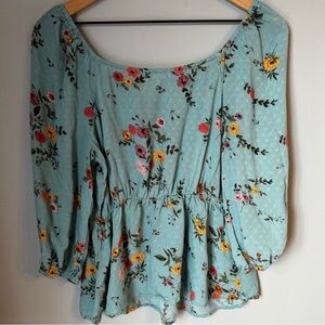 This is a vibrant blue floral Maurice’s peasant top with a scoop neck and button detail. It has a gathered waist in the back and long peasant sleeves.