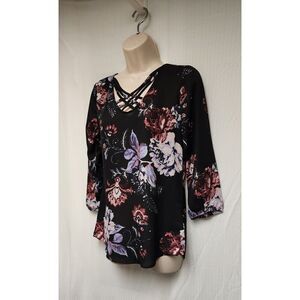Maurices Floral 3/4 Sleeve V Neck Criss Cross Sheer Chiffon Black Blouse Size XS