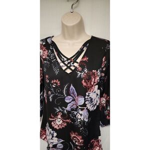 Maurices Floral 3/4 Sleeve V Neck Criss Cross Sheer Chiffon Black Blouse Size XS.