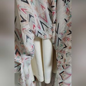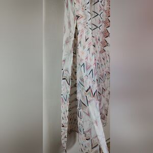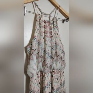 Stylish halter maxi dress with a geometric pattern. Features a blend of soft colors for a chic look. Cute keyhole and ladder back with long side slits, liner ends above the knee. Great pre-owned condition with no flaws noted.