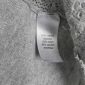 Maurices lightweight open-front cardigan in soft gray with a beautiful open-knit lace back and sleeve detail. Flowy, easy layering piece with a feminine drape. Rayon/nylon/acrylic blend for soft stretch and comfort. Pre-owned with normal wear, no major flaws.