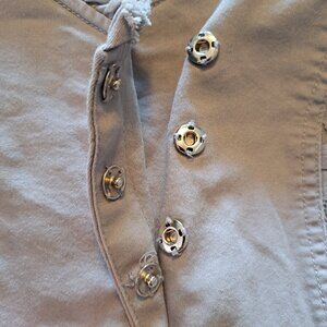 Super cute jacket from Maurices. Solid gray with lace accents on the sides and sleeves, and ruffles at the collar. Three snap buttons for closure toward the top of the jacket. The bottom button has one side that is coming undone; can be fixed. Lightweight and stretchy. Size Large; measures about 18 inches between the pits, 21 inches long and 24 inch sleeves.
