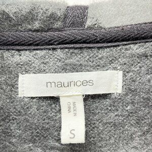 This Maurices sweater jacket is a gray and white checker blazer in size Small. It has a hood, long sleeves, and is made of lightweight polyester material. This mid-length jacket is suitable for various occasions like travel, parties, or casual and business settings. It features pockets and an open style, making it perfect for winter, fall, and spring seasons. Easy to care for with machine washable instructions.